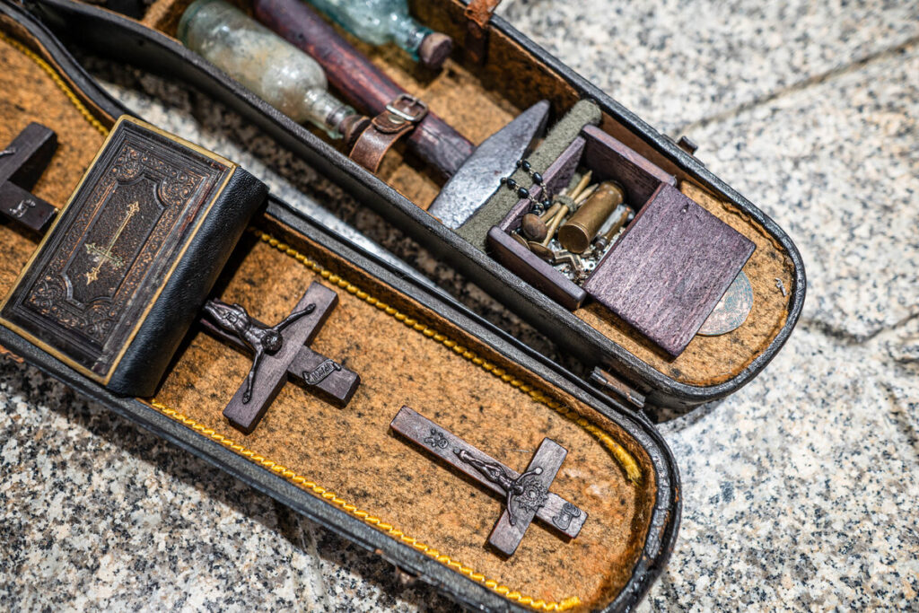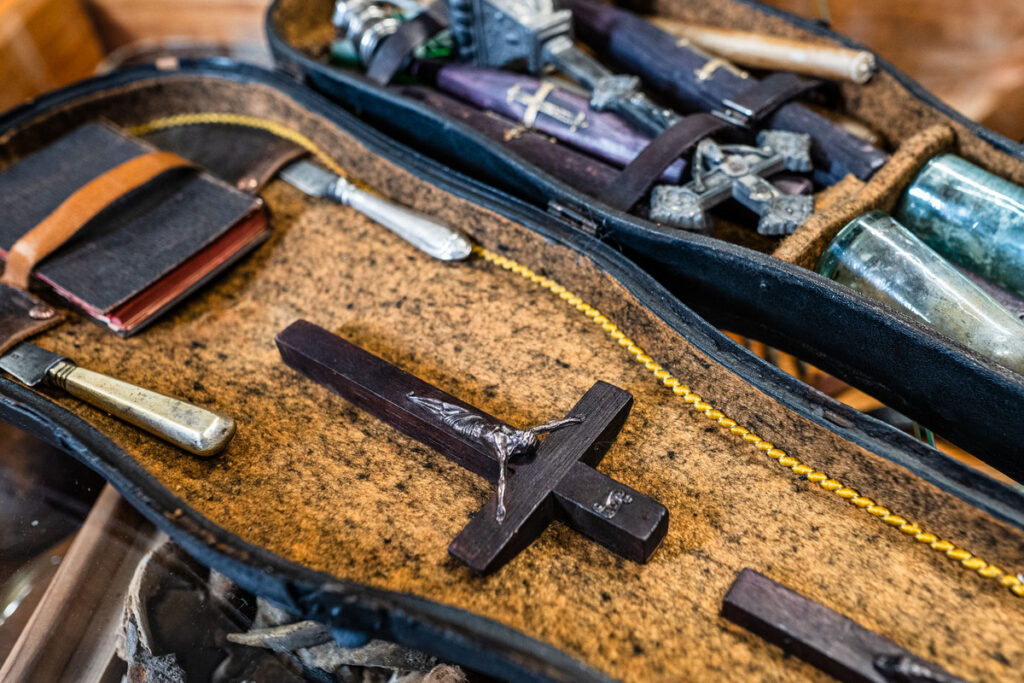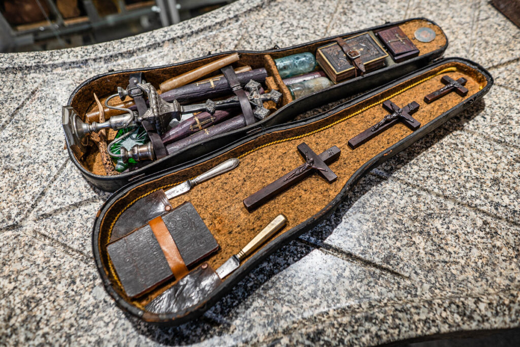 Wooden stakes for piercing the heart, iron nails, exorcism accessories, and other tools once believed to ward off dark forces—these are all part of a new acquisition by WMU. Dating back to the first half of the 20th century, a so-called vampire-neutralisation kit has been on display since January at the Museum of Forensic Medicine at Wroclaw Medical University.