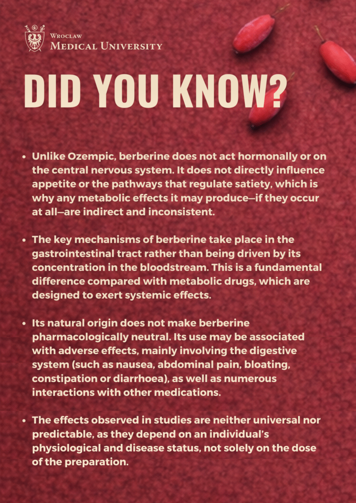 In recent years, berberine has increasingly appeared in the public sphere as a “natural way” to improve metabolism. In social media, it is sometimes compared to incretin drugs and even referred to as “plant-based Ozempic.” Such comparisons suggest a simple mechanism of action and predictable effects. However, the review “Berberine in Bowel Health: Anti-Inflammatory and Gut Microbiota Modulatory Effects” shows that this narrative is an oversimplification that does not reflect either berberine’s mechanism of action or the scope of clinical evidence.