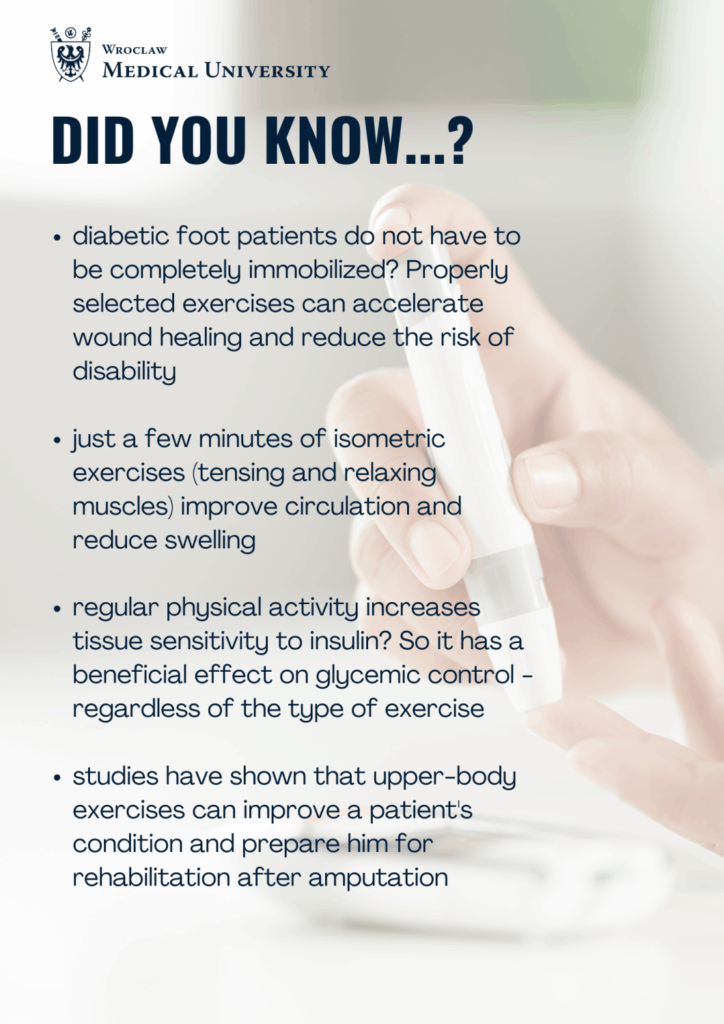 The review, prepared by researchers from the Wroclaw Medical University and Gdański Uniwersytet Medyczny (Medical University of Gdańsk), integrates knowledge from both basic and clinical research, as well as evidence-based recommendations. The authors demonstrate that functionally tailored exercises not only do no harm, but can support the therapy of the diabetic foot by improving the integration of the musculoskeletal system and stimulating spontaneous regeneration processes. The conclusions are clear: well-planned, individualized exercises should be an integral part of the therapeutic process for the complication above at every stage. In addition to accelerating the healing of lesions, exercise prepares patients for further stages of management.