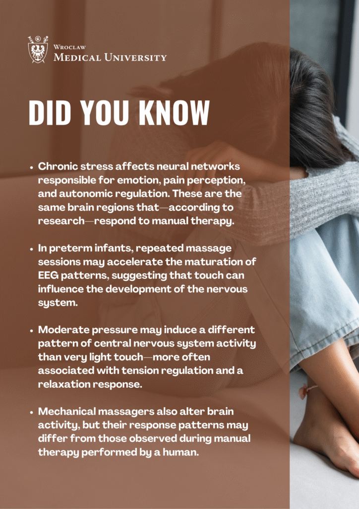 Massage induces measurable changes in the activity and connectivity of neural networks responsible for stress regulation, pain processing, and emotional modulation. With repeated sessions, adaptive signals were also observed, which may be inter“Massage is not classical primary prevention,” notes Professor Kurpas, “but it may affect regulatory systems associated with stress and pain. This could also be relevant in secondary prevention and in reducing symptomatic burden. The findings justify further research; however, they do not constitute grounds for system-level recommendations.”preted as potential neuroplastic processes.