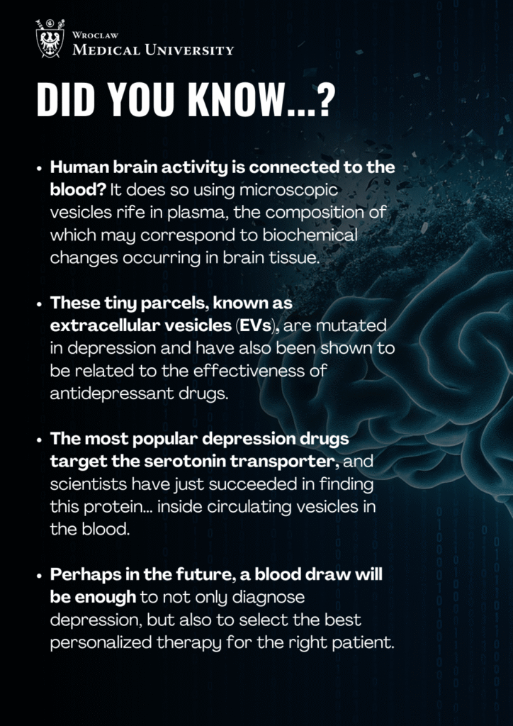 Depression is not just a state of mind, but an extremely complex biochemical game going on throughout the body.The latest research by a Polish-Austrian team of scientists, initiated by Dr. Lukasz Zadek of Wroclaw Medical University, shows how microscopic “letter carriers” – extracellular vesicles – can not only indicate the presence of disease, but also predict the effectiveness of treatment.